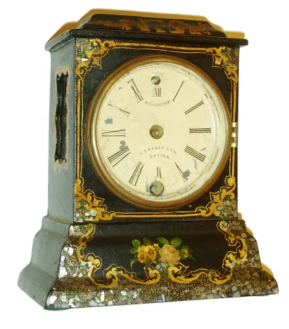 Litchfield Mfg. Co. for J. J. Beals & Co., Boston 8 days, lever movement paper mache with MOP cased shelf clock, c1851.