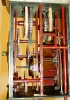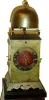 Japanese lantern clock, single foliot, on a later [but not new] pyramid base, weight driven, from the Doug Shaffer collection, c1790 this clock will need some restoration. Inside the case, all the arbors and uprights have been painted with red nail polish to cover a coating of rust [pinions and wheel teeth are Not painted], The dial suffered a bump that has resulted in the loss of several numerals, and the balance of the enamel with cracks and glue repairs. Bell is original; top nut home-made. The well made stand appears to be late 19th century, and has been carefully copied from an original, and with one trapezoidal panel that opens for winding. Note photo shows 2 small iron counter weights, however the large driving weights are here, just not in photo. Ht of clock only = 12" Overall with stand 42"