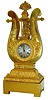French mantel clock, gilt bronze lyre form case with pendulum oscillating behind the "strings", ornamented with gilt mounts of waterleaf, anthemion, and horn of plenty with an overflowing fruit basket at top, scallop shell bezel, pendulum also decorated
