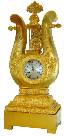 French mantel clock, gilt bronze lyre form case with pendulum oscillating behind the "strings", ornamented with gilt mounts of waterleaf, anthemion, and horn of plenty with an overflowing fruit basket at top, scallop shell bezel, pendulum also decorated with scallop shells and sea horses, 8 days, time and strike, Pendule a Paris movement, Roman numeral, engine turned, silvered dial, blued steel Breguet style hands, c1830 Case surface with minor dirt, gilding possibly renewed on bezel, otherwise good and with minor wear, pendulum casting with rough surface, not well finished, and with loss to gilding, pendulum with replaced back, dial numerals repainted, hands with oxidation, minor rust, movement ticks and strikes, will need adjustment, bell mounting stand and nut replaced, back cock replaced, crutch repaired/ extended, movement mounting ring replaced, and stamped "Swiss", Ht 21"