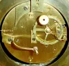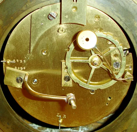Case surface with minor dirt, gilding possibly renewed on bezel, otherwise good and with minor wear, pendulum casting with rough surface, not well finished, and with loss to gilding, pendulum with replaced back, dial numerals repainted, hands with oxidation, minor rust, movement ticks and strikes, will need adjustment, bell mounting stand and nut replaced, back cock replaced, crutch repaired/ extended, movement mounting ring replaced, and stamped "Swiss", Ht 21"