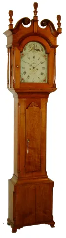 Solomon Yeakel, Berks County {PA), walnut scroll top tall clock, with 30 hours, brass movement, made with extra gear, seconds bit and false winding posts to simulate an 8 days, clock. Dial is marked "Barcks County", from the collection of Doug Shaffer,
