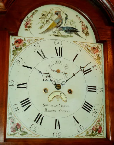 Solomon Yeakel, Berks County {PA), walnut scroll top tall clock, with 30 hours, brass movement, made with extra gear, seconds bit and false winding posts to simulate an 8 days, clock. Dial is marked "Barcks County", from the collection of Doug Shaffer, c1800 solid walnut case is Heavy and robust; refinished with clear lacquer, so looks quite light. The painted dial featuring 3 birds in the arch and roses in the spandrel area is excellent, with only slight fading of the signature on the right side. 13" painted dial and signature are original and excellent. Movement was serviced, however a spring has failed and the spiked wheel is not being held against the click; secondarily the strike fan is loose on its arbor. This clock is unusual as it has false winding squares (it is pull chain wound) and also has a seconds dial (unusual for 30-hour tall clocks as an additional gear must be added to the time train to reverse the escape wheel direction for a seconds hand. Ht 98"