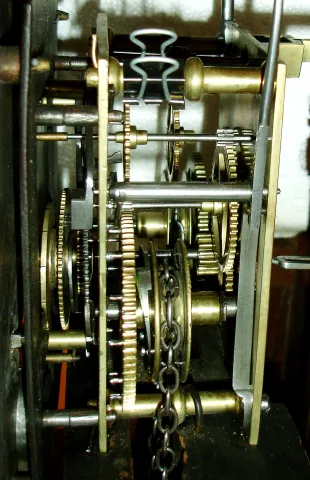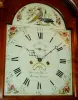 solid walnut case is Heavy and robust; refinished with clear lacquer, so looks quite light. The painted dial featuring 3 birds in the arch and roses in the spandrel area is excellent, with only slight fading of the signature on the right side. 13" painted dial and signature are original and excellent. Movement was serviced, however a spring has failed and the spiked wheel is not being held against the click; secondarily the strike fan is loose on its arbor. This clock is unusual as it has false winding squares (it is pull chain wound) and also has a seconds dial (unusual for 30-hour tall clocks as an additional gear must be added to the time train to reverse the escape wheel direction for a seconds hand. Ht 98"