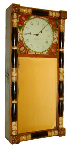 Benjamin Morrill, Boscawen, N.H., NH mirror clock, 8 days, time only, weight driven iron plate movement in a picture frame style case with mirror tablet and reverse painted dial surround and painted metal dial, c1825 the case front, top glass and dial are in untouched original condition. The case housing the movement and dial has been repainted black. This movement does not have the typical NH wheelbarrow plates, they are rectangular and made of iron. The movement is fastened with fillister screws with nuts on the backboard. The keystone on the pendulum is very distinctive with a cutout on the inside lower left corner. Please see Charles Parsons' "New Hampshire Clocks & Clockmakers" page 195 for this specific clock. Additionally, this actual clock was illustrated on p. 43 in the book "Clocks" written by Doug Shaffer for the Smithsonian Illustrated Library of Antiques, 1980 Ht 30"