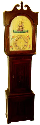 German tall clock with organ, 8 days, time and strike, weight driven wooden and brass movement playing 8 tunes listed inside door of musical mechanism through 33 pipes in a mahogany veneer case with painted wooden dial, c1830