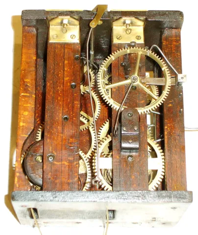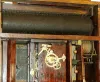 the case retains its original finish. The right side of the hood is damaged, missing the right side molding. Two top finials are absent. The dial is f...