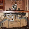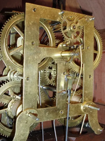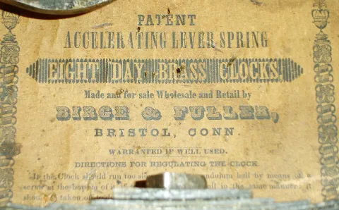 Birge & Fuller, Bristol, Conn., 8 days, time and strike, wagon spring steeple on frame with candle finials or double steeple shelf clock, c1845 Mahogany veneered case in an old and possibly original finish with some damage on the base, small chip on the bottom door and a small chip at the very top and one corner. Original painted dial with some loss at the mounting pins, in the center and at the winding holes. Movement is signed. Both glasses are original with loss. Nice label inside the case. Hands are period but not original Ht 25"