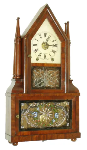 Birge & Fuller, Bristol, Conn., 8 days, time and strike, wagon spring steeple on frame with candle finials or double steeple shelf clock, c1845
