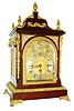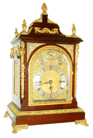 England, triple fusee bracket clock, Georgian style mahogany case with ornate gilt bronze mounts, paw feet, caryatid corners, acanthus leaf decorated base molding and door, the top with urn finials and floral swags and with central pineapple finial, the