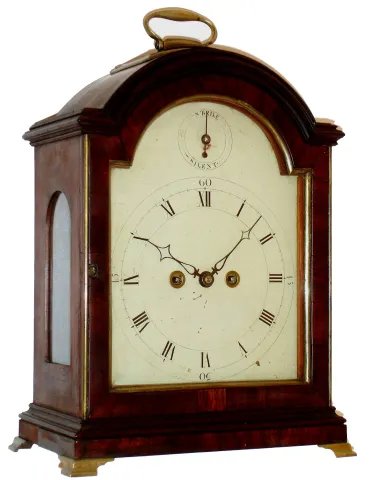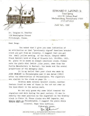 Attributed to , Philadelphia, Penn., American bracket clock, 8 days, time and strike, spring driven fusee movement in a mahogany case with painted metal dial, c1812 the case retains its original finish with scattered veneer repairs. The top curved pad has a 2 inch age split and the rear door is slightly warped. A side glass and the rear door glass are cracked. The Curtis iron dial manufactured in Boston retains its original paint with minor flaking. This clock includes a letter of attribution from Edward Lafond to Douglas Shaffer, dated June 1st, 1992 referencing a similar clock presented at the Philadelphia Chapter NAWCC clock exhibit held at King of Prussia, October 26th - 28th, 1972. See plate 19 of the exhibit program for an almost identical example. Ht 20"