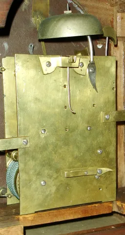 the case retains its original finish with scattered veneer repairs. The top curved pad has a 2 inch age split and the rear door is slightly warped. A side glass and the rear door glass are cracked. The Curtis iron dial manufactured in Boston retains its original paint with minor flaking. This clock includes a letter of attribution from Edward Lafond to Douglas Shaffer, dated June 1st, 1992 referencing a similar clock presented at the Philadelphia Chapter NAWCC clock exhibit held at King of Prussia, October 26th - 28th, 1972. See plate 19 of the exhibit program for an almost identical example. Ht 20"