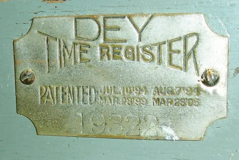 Dey Time Register, Endicott, N.Y., time recorder, 8 day twin-spring time only, Seth Thomas oversize movement, no recording mechanism, in oak case, now painted, c1910