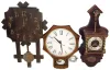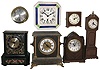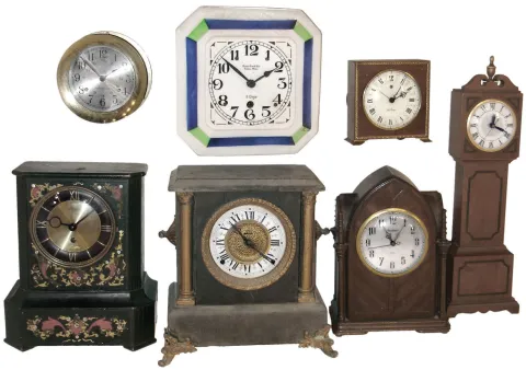 Clocks- 10 (Ten): Seth Thomas modern brass ship's bells; German porcelain plate with "Daniel Low, Salem, Mass." on dial; enameled wood Ingraham; Mission oak wall, Zaandam wall; United electric school clock; Seth Thomas plug-in alarm; Welby painted wood