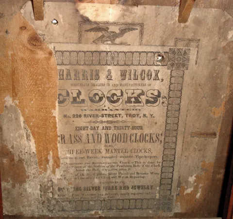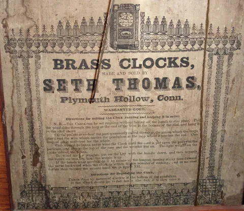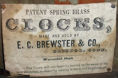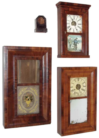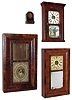 Clocks- 4 (Four): (1) E. C. Brewster, Bristol, Conn., 30 hours, time and strike, iron back plate spring movement shelf clock, c. 1835. (2) Bradley & Hubbard small empty iron case (only), c. 1865. (3) Seth Thomas, Plymouth Hollow, Conn., 30-hour, time
