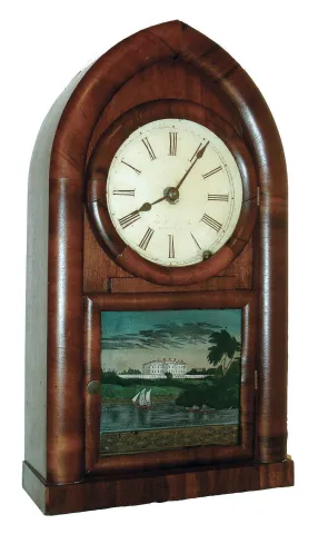Brewster Manufacturing Co., Bristol, Conn., 8 days, time and strike, round gothic or beehive shelf clock, c1855 Rosewood & mahogany veneered case with repairs on the base, some lifting of the veneer on the door and several age cracks on the round door bezel. Original painted dial with some wear and paint loss at the mounting screws, a couple of spots on the edge and at the winding arbors. Hands are replaced. Original decalcomania tablet of the White House. Dark, but readable label. Ht 19"