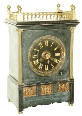 French 8 days, time and strike, marble mantel clock with bronzed decoration and black dial, c.1890 the black stone case has become faded and dull, but the black dial, with gold applied numerals, remains glossy. The little bronze plates across the bottom depict classical figures. The top gallery is complete. The minute hand and pendulum are absent. The small lever, actuated from the front below the VI, nudges the pendulum rod and then spring back out of the way. Ht 15"