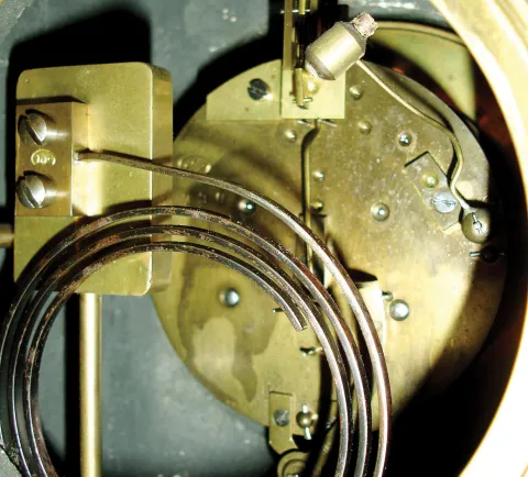 the black stone case has become faded and dull, but the black dial, with gold applied numerals, remains glossy. The little bronze plates across the bottom depict classical figures. The top gallery is complete. The minute hand and pendulum are absent. The small lever, actuated from the front below the VI, nudges the pendulum rod and then spring back out of the way. Ht 15"