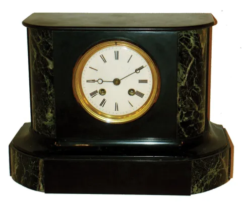 French marble 8 days, time and strike, mantel clock with curved sides, S. Marti Medaille de Bronze movement with count wheel and bell striking, c1890 this unusual shape case, with big curved green marble front corners, is in very good condition with no flaws. The white porcelain dial and beveled glass front and back doors are fine. The pendulum number matches the movement's. Ht 8 1/2"
