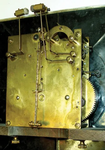 the case was nicely refinished, and there are some woodworm holes on the base and crest. The glasses are old and wavy. The thin brass dial is okay. T...