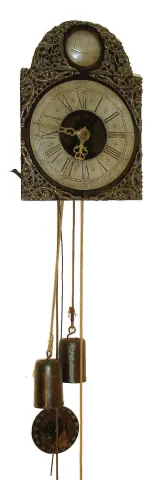 dial with heavy wear to velvet, chapter ring with bends, hands with tarnish, movement with repairs, pendulum split in half and with losses, incorrect ...