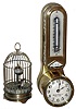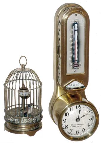 Clocks- 2 (Two): Occupied Japan moving bird in brass cage 30 hour novelty clock with annular dial, c1947; Minneapolis brass 8 day 7 jewel thermostat clock with thermometer, c1930 the little feathered bird twitches correctly, and this cute novelty is in very nice original condition, ht 51/2" The thermostat clock has the best and brightest finish we have seen on these, the thermometer tube is intact, the signed dial is fine, and the movement ticks and stops, ht 9 1/2"