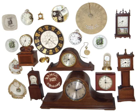 Clocks & NAWCC Memorabilia: GE plug-in chiming tambour, Seth Thomas 4 jewel small tambour, 1972 sundial, Burroughs miniatures, 9 ashtrays, other small novelties, 20th century