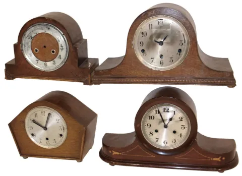 Clocks- 4 (Four) 8 day wood case mantel clocks: British Westminster-chime oak case; British time and strike oak case; German time and strike mahogany case; and German double-chime 3-train oak case, early 20th century these are ready for parts or restoration, and mostly complete except for missing bezels and glasses. Cases are original with minor flaws. Sold as is, no further details available. Largest ht. 10"