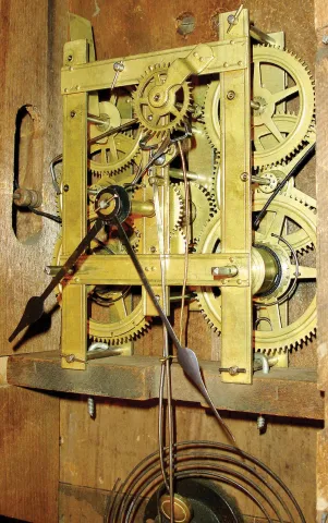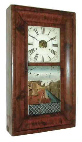 Mahogany case retains original but somewhat rough finish with a few veneer chips and a few veneer patches. The painted metal dial is faded and has some flaking in multiple locations. The hands are old, but may not be original. The top and bottom glasses are original with some flaking of the scene ("View of Venise") on the bottom glass. Ht 29 1/2".
