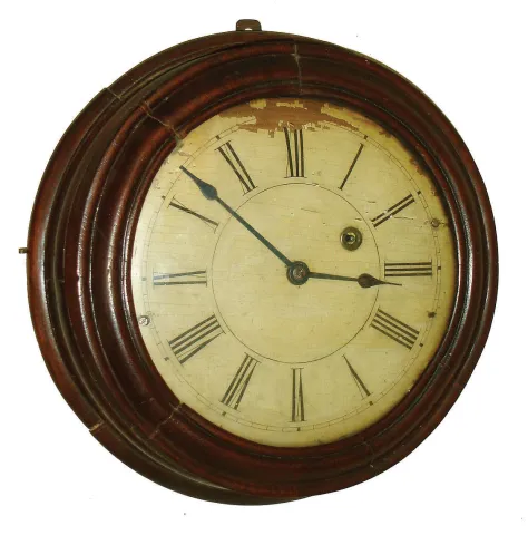 Deeply turned solid walnut case with old finish. There is separation of some the segments that make up the case front. One segment that fits on the back of the case appears to be replaced. Original painted convex wood dial has paint loss in the 12 o'clock area and other small scattered losses. Remains of a paper label on the backboard. The minute hand is a replacement. Movement is signed. Ht 14"