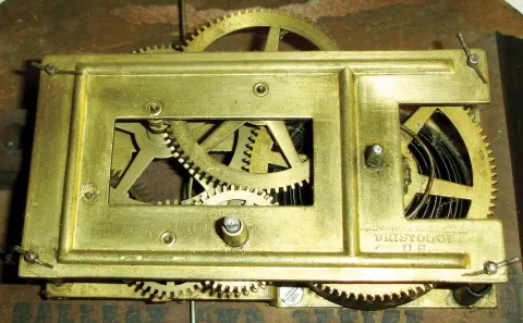 Brewster & Ingrahams., Bristol, Conn., 8 days, spring brass movement gallery timepiece, c1850 Deeply turned solid walnut case with old finish. There is separation of some the segments that make up the case front. One segment that fits on the back of the case appears to be replaced. Original painted convex wood dial has paint loss in the 12 o'clock area and other small scattered losses. Remains of a paper label on the backboard. The minute hand is a replacement. Movement is signed. Ht 14"