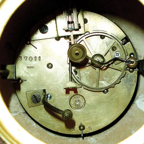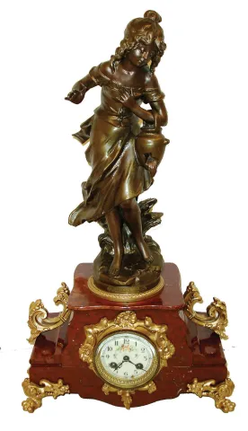 France, figural mantel clock "La Cruche Cassee" or the broken jug, shaped red marble case with gilt paw feet and side ornaments, gilt dial surround, gilt bezel with beveled glass, top with patinated female figure carrying a damaged jug, leaking its contents, the base with engraved plaque "La Cruche Cassee par Francois Moreau", Arabic numeral white enamel dial, blued steel hands, 8 days, time and strike, pendule a Paris movement, c1900 Marble with some glue and fill repairs and now with coat of lacquer, top reshaped to eliminate chips, gilt hardware now painted gold, gaps between case and feet, rear left foot with broken ornament, figure with restoration to surface, figure repositioned on base, dial with hairlines and chip, hands painted black, movement ticks and strikes, Despite some cosmetic negatives, it is overall an attractive clock. Ht 22 3/4"