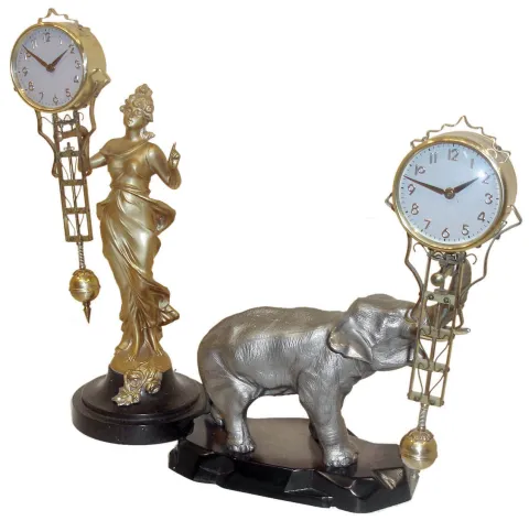 Clocks- 2 (Two) Japan 8 day swing clocks: Diana and elephant figures, late 20th century these appear to be in very good original condition with no losses, damage or discoloration. Both swing and tick but were not tested long-term. Overall hts 14" and 11 1/2"