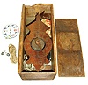 Clocks- 2 (Two): (1) Wooden works weight driven, foliot escapement timepiece, sold as a souvenir at the Columbian Exposition, Chicago, which began in 1892. The clock front is embossed with a dial, a bust of Columbus and his name at top, and the year 1492