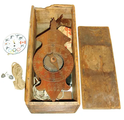 Clocks- 2 (Two): (1) Wooden works weight driven, foliot escapement timepiece, sold as a souvenir at the Columbian Exposition, Chicago, which began in 1892. The clock front is embossed with a dial, a bust of Columbus and his name at top, and the year 1492 at bottom. This clock comes complete with its original wooden shipping box, with label, C.1892, (2) a German 30 hours, pendulette souvenir clock from the 1988 Winter Olympics,. the box has a chunk out of one end and one side from dropping in transit; the label identifying it as a "Columbus Clock" is worn but the name of the clock is quite clear. It is complete with original cord and black iron weight. Ht of clock = 14", length of pine box = 15" Diameter of souvenir clock = 4 1/2"