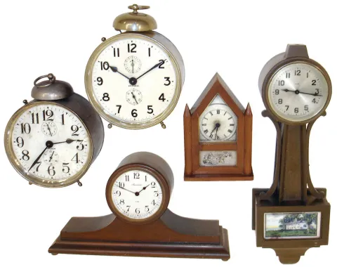 Clocks- 5 (Five) alarm and novelty: Ansonia small 8 day time only, mahogany tambour; Burroughs "No.49T Steeple Gothic" time only; two Ansonia oversize alarm clocks, one marked "Amazon"; New Haven 12-day miniature banjo; early 20th century
