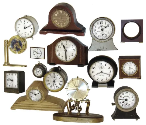 Clocks- 15 (Fifteen) alarm, novelty and 400-day: Ansonia "Square Pirate"; Benchmark world time quartz; Gilbert "Moonlight"; Sessions plug-in; Ansonia round alarm (no feet); two Westinghouse Automatic Electric Range clock/timers; Seth Thomas "Severn" and a