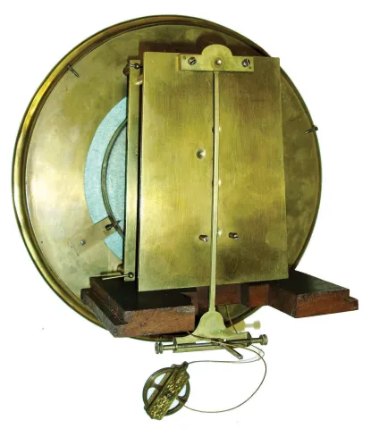 Shaped wooden case has an old worn dark finish and is missing a top crest. The lower pin in the front door is absent, so use care when opening the doo...