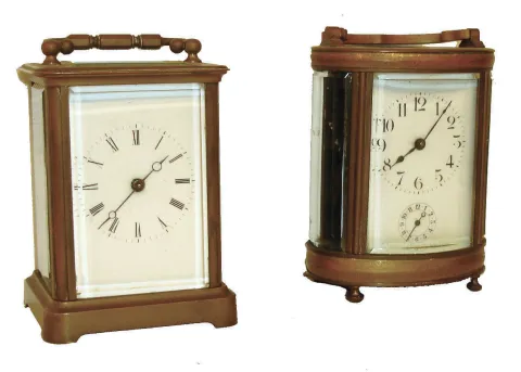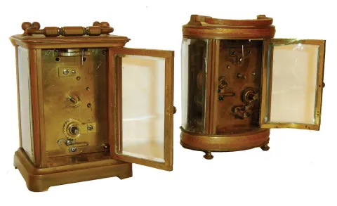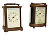 Clocks- 2 (Two): French carriage clocks, the first with typical brass case and beveled glass panels, Roman numeral white enamel dial, Breguet style hands, 8 day timepiece movement with cylinder platform, the other with oval brass case and turned brass