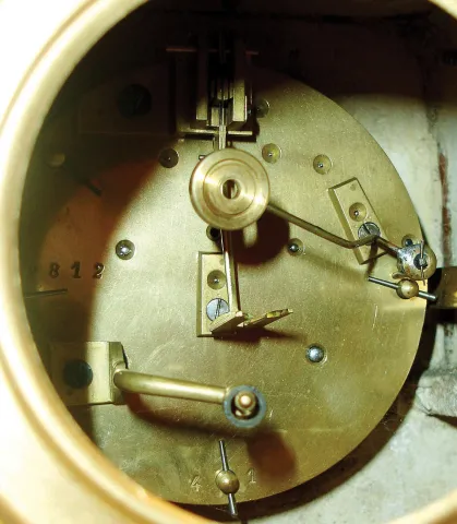 France, figural mantel clock, the variegated pink marble case with gilt paw feet, gilt dial surround and with gilt side ornaments, the top with patinated female figure, the base with engraved plaque , "Les Bles par Belin", Roman numeral enamel dial in blue and gold, the center with painting of 2 birds and roses, gilt hands, 8 days, time and strike, pendule a Paris movement, c1900 Case coated with lacquer, gilt ornaments now with gold paint, statue refinished, figure missing an item originally held in right hand, figure possibly not original to case, dial good, gilt hands, movement ticks and strikes, dial and movement not original to clock, Despite being a consortium of pieces, they are all from the same period and overall the clock makes an impressive decorative presentation. Ht 22 3/4"