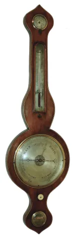 English mercury wheel barometer with thermometer and hydrometer in a mahogany veneered case with bone indicator knob, c1860