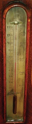 English mercury wheel barometer with thermometer and hydrometer in a mahogany veneered case with bone indicator knob, c1860 the mercury tube is full. This item must be hand delivered. Ht 35"