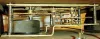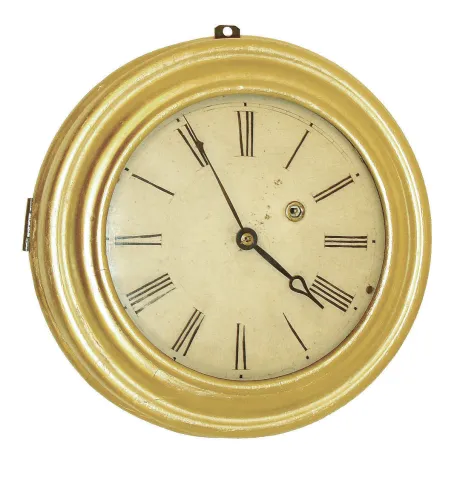 Brewster & Ingrahams, Bristol, Conn., 8 days, gallery timepiece, c1845 Wood bezel originally gilded is now gold painted. Original painted wood dial with some wear to the chapter ring. The minute hand is period, but a replacement. Remains of original label inside the case. Ht 13 1/2"