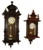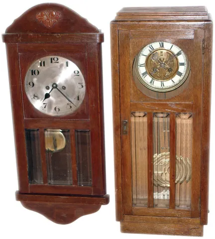 the cases are mostly complete and retain their old finishes, The oak clock, with its fancy brass dial center and matching pendulum, is missing its sid...