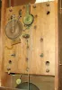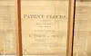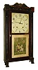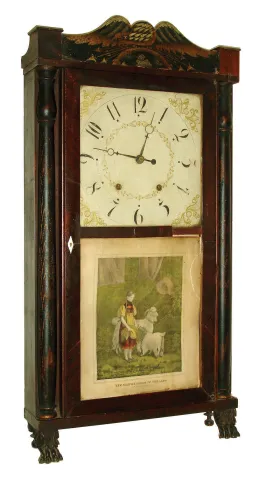 Mahogany veneered case in original finish with veneer loss on the cross piece, some lifting, and loss to some of the stenciling on the columns. Right chimney appears replaced. Original painted dial with some wear. Hands are original. Tablet is a replaced by an old print behind clear glass. Clean label inside case. Ht 33 1/2"