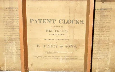 E. Terry & Sons, Plymouth, Conn., 30 hours, time and strike weight wood movement stencil column & eagle splat shelf clock.