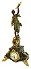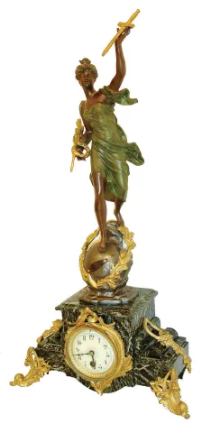 France, figural mantel clock, green variegated marble case on gilt scroll feet with naturalistic ornament and with gilt drops at the sides, and with a patinated female figure representing Victory, with applied plaque engraved "Victoire par Bruchon", dial surround in the rococo style, cast bezel with beveled glass, Arabic numeral white enamel dial, blued steel hands, 8 day pendule a Paris timepiece movement, c1910 marble case with repaired chip and now with a coat of lacquer, gilt surfaces now painted gold, rear feet loose, clock leans forward, ornaments at case sides are from a different clock and do not fit correctly, patinated surfaces on female figure good, dial with hairline, hands good, ticks. Overall an impressive clock. Ht 25"