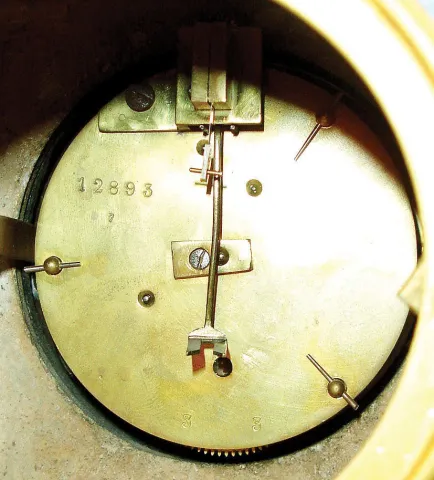 marble case with repaired chip and now with a coat of lacquer, gilt surfaces now painted gold, rear feet loose, clock leans forward, ornaments at case sides are from a different clock and do not fit correctly, patinated surfaces on female figure good, dial with hairline, hands good, ticks. Overall an impressive clock. Ht 25"
