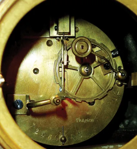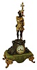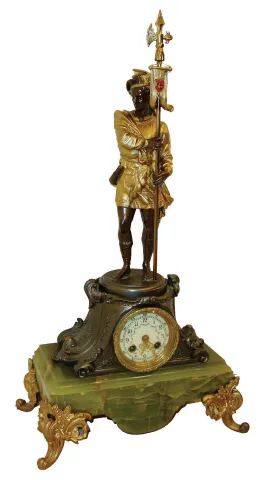 France, figural mantel clock, the green onyx base on French scroll feet, the cast clock case with acanthus ornament, the top with standing male figure, Arabic numeral white enamel dial with floral garlands, gilt Louis XV hands, 8 days, time and strike, pendule a Paris movement, c1910 All case components with restored finishes, added shield shaped ornament on banner, stone with minor flakes, ornamental ring for top of case (under figure) missing, two holes for missing ornament now concealed with brass upholsterers tacks, dial with minor flake at time winding arbor, hands good, ticks and strikes, needs service, pendulum and bell nut replaced, overall a decorative item. Ht 24"
