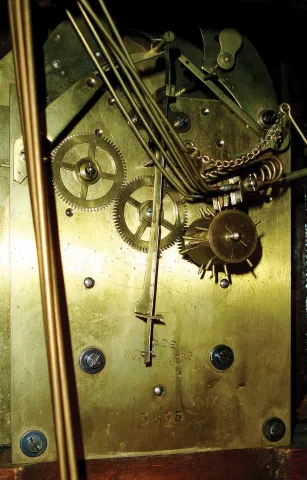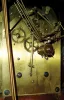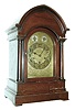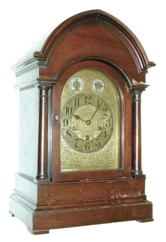 Germany, chiming mantel clock, mahogany case with turned columns, stepped, molded base, and molded, lancet arch cornice, engraved brass dial with Arabic numeral silvered chapter ring, chime/ silent indicator and regulator, blued steel hands, brass 8 day